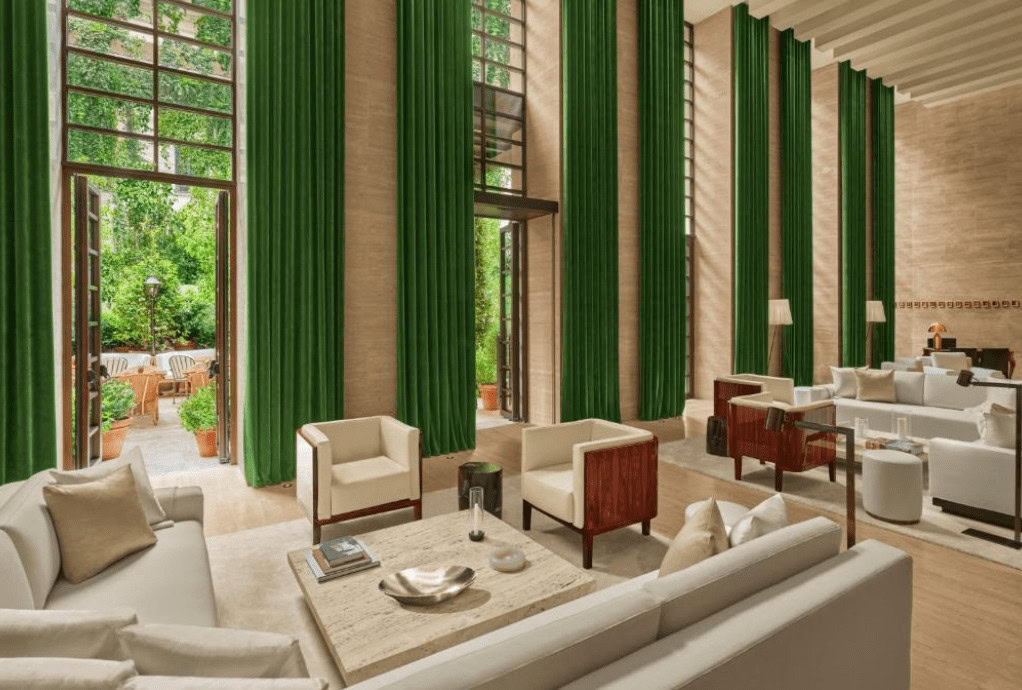 Как и во всех отелях Edition, лобби отеля уделено особое внимание. Отличаясь семиметровыми потолками, травертиновыми стенами и полами, это пространство действительно впечатляет. На седьмом этаже отеля расположен ресторан The Roof, с которого открывается панорамный вид на Пантеон, базиликy Сант-Андреа-делла-Валле и весь Рим. На открытой террасе расположен большой, красивый бар, бассейн из травертина, окруженный шезлонгами из цельного тикового дерева и бронзовыми вазами.