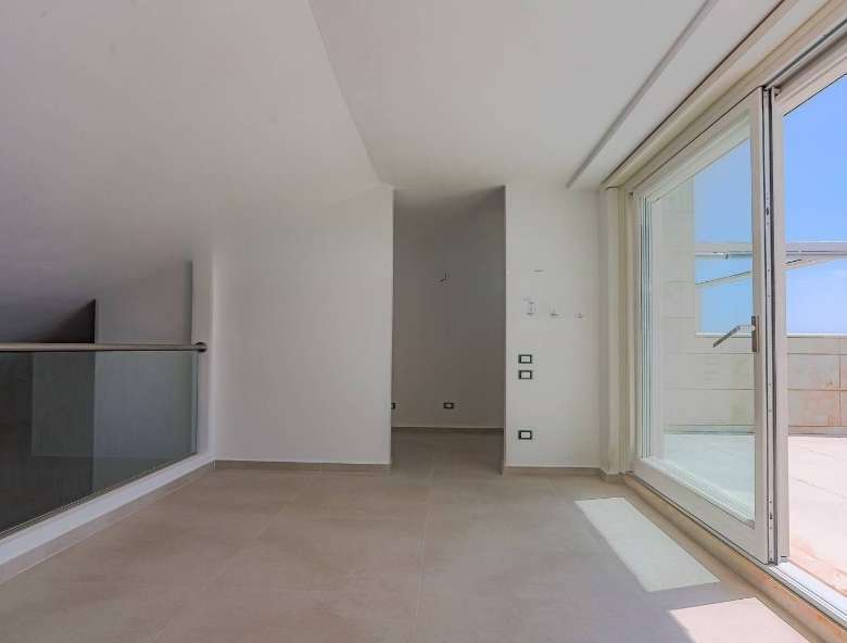 - Спальня с двуспальной кроватью, с видом на море и выходом на террасу через широкое раздвижное окно.