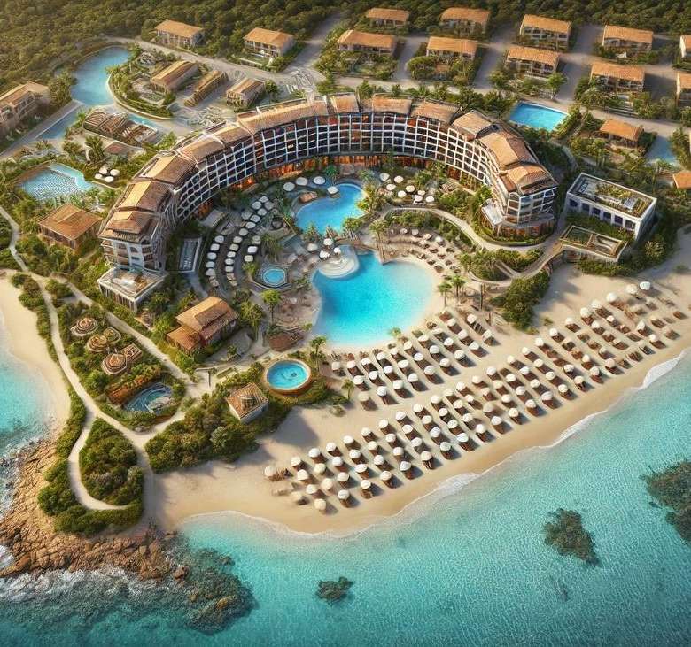 Отель включает в себя 160 юнитов (апартаменты и номера) с видом на море; ресторан с верандой, рассчитанный на 240 гостей; кафе-бар; конференц-зал; два открытых бассейна с морской водой; полностью оборудованный пляж с частным причалом и парковку.