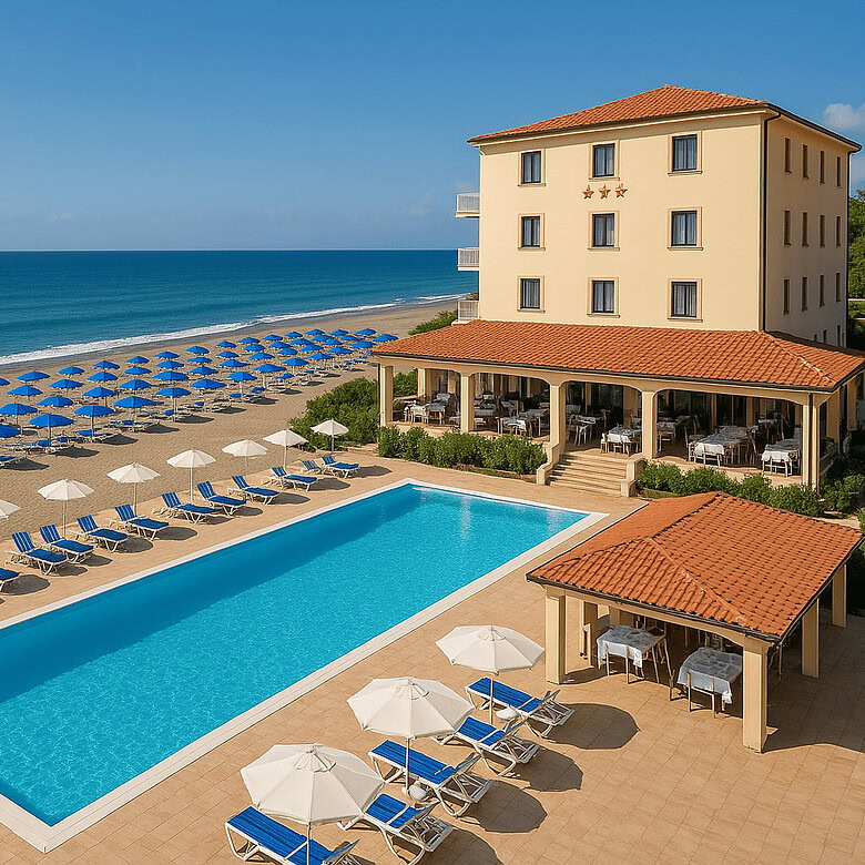 Отель располагает панорамным видом на Тирренское море, бассейном и просторным рестораном, что делает его идеальной локацией для проведения свадеб, банкетов и других мероприятий.