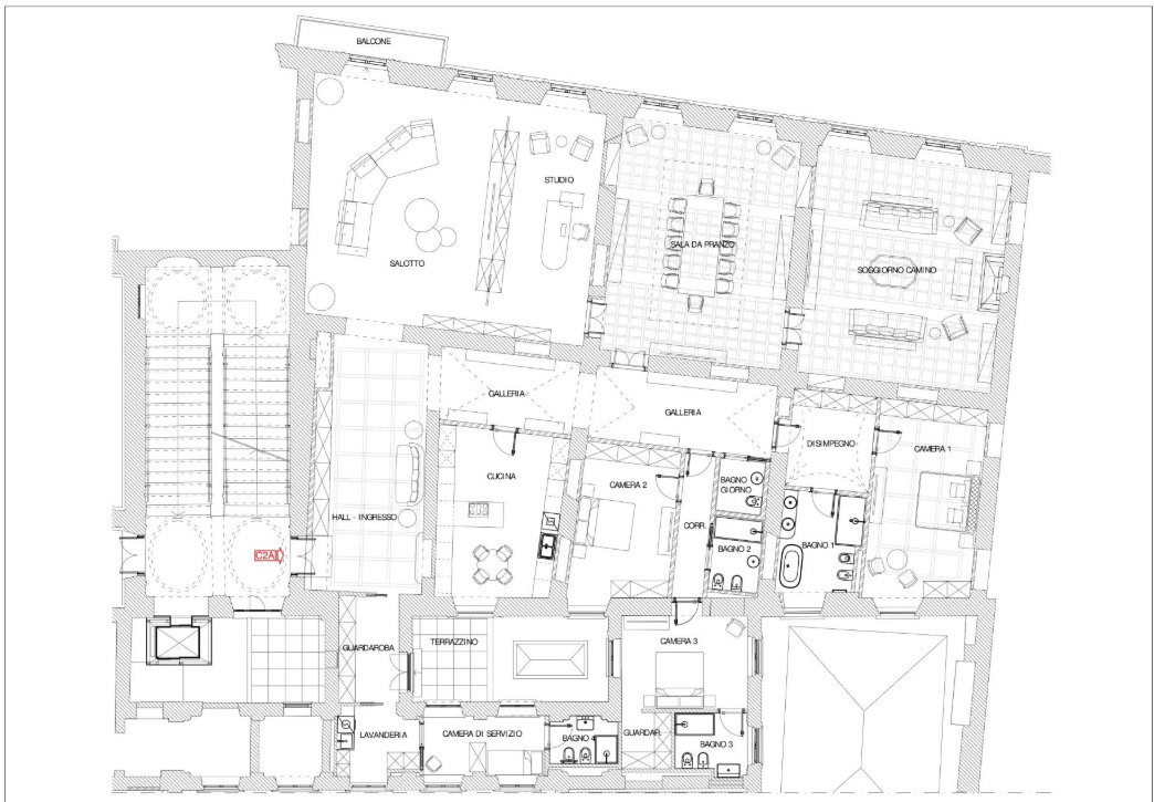 Из роскошного входного зала открывается доступ в три смежных салона, каждый из которых отличается уникальными элементами: балконом XVIII века с видом на Виа дель Корсо, ценной деревянной обшивкой (boiserie) и изящным камином.