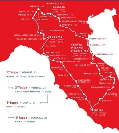 Mille Miglia была признана одной из самых красивых дорожных гонок мира из-за маршрута, проложенного через удивительные места и города Италии: Брешиа – Парма – Лукка – Сиена – Витербо – Рим – Милано Мариттима – Равенна – Феррара и др.